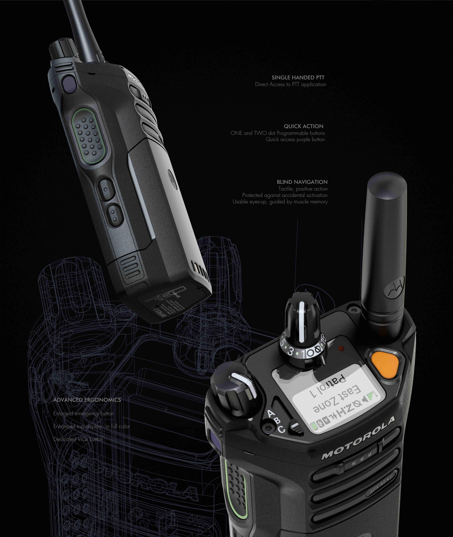 During ideation, We merged industrial design expertise with the unique demands of public safety professionals. My focus was on marrying ruggedness with innovation, resulting in a device that not only adhered to military standards but also featured a mission-critical touchscreen resilient in adverse conditions. As the fifth generation of public safety radios, we introduced a fresh design language, preserving legacy elements like the Speaker and PTT button. The standout design innovation was strategically cutting the form into sections, creating an optical illusion to make the radio appear smaller while accommodating essential components. This intentional detail showcased our commitment to blending form and function seamlessly in APX NEXT.